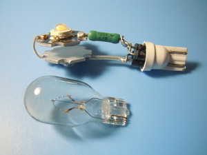 そこで、電球をLED化することにした。リレーからの電流は約6Vの交流である。整流しなければLEDに代えることはできない。電圧も微妙である。そこで、とりあえずダイオードを1本入れて、電流制限用の抵抗と1w LEDを2本直列にして試してみた。点灯したのだが、直視している時には気にならないが、視界に入るような見方をすると、LEDの瞬きが気になる。50Hzとは言え、半波整流では無理なようである。また、抵抗値によっては、最初は点灯していても、LEDが熱を持ってくると点滅になってしまう現象も起きた。